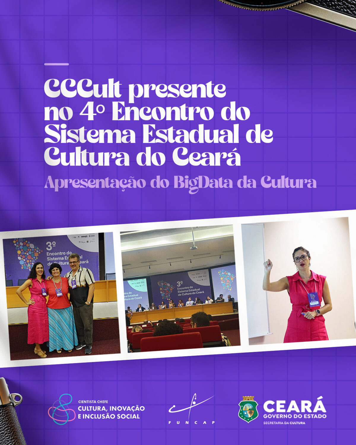 O 1º Encontro de Comunicadores Municipais da Cultura do Ceará faz parte da programação do 4º Encontro do Sistema Estadual de Cultura do Ceará, destacando a importância da Comunicação como pilar imprescindível da política pública bem executada. A participação do CCCult será nesta quinta-feira (05/06), às 9h40, na Assembleia Legislativa do Estado do Ceará, em Fortaleza