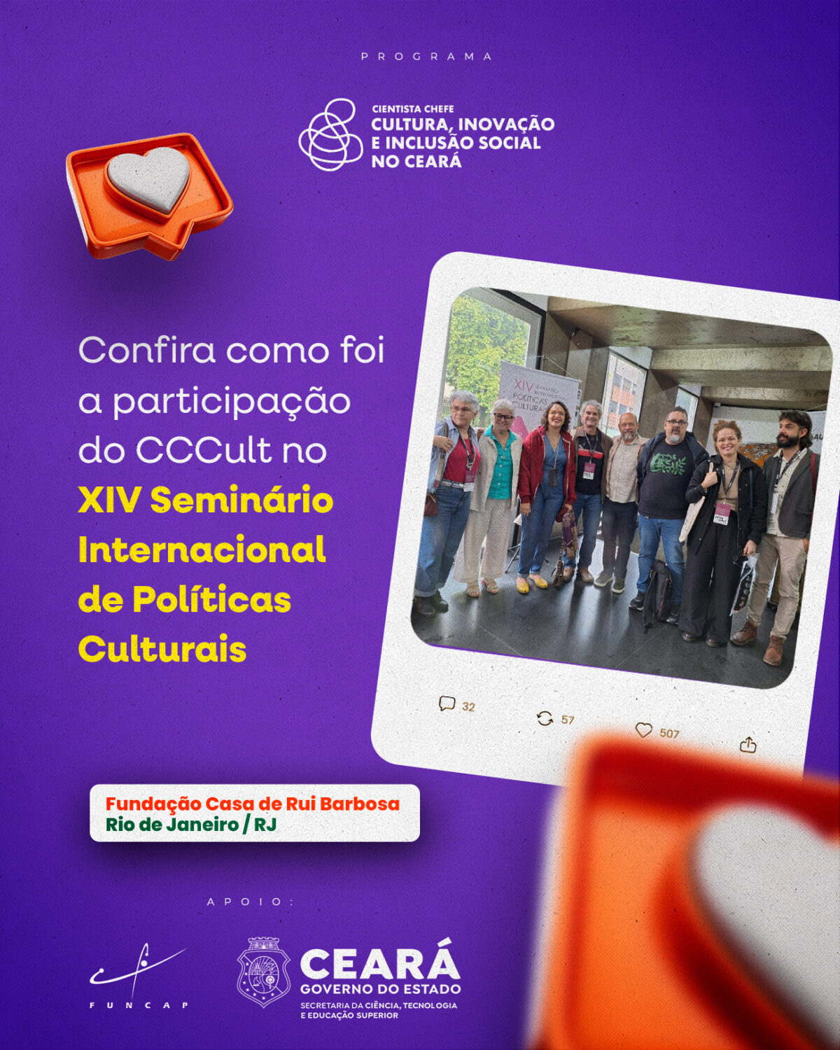 Pesquisadores(as) do Programa Cientista-Chefe da Cultura (CCCult) estiveram no Rio de Janeiro no período de 30 de junho a 04 de julho, participando das atividades do XIV Seminário Internacional de Políticas Culturais. A atividade foi organizada pela Fundação Casa de Rui Barbosa, no Rio de Janeiro. Ao todo, seis pesquisas diretamente ligadas ao CCCult foram apresentadas no evento.